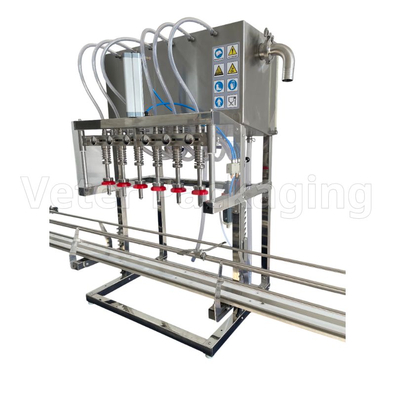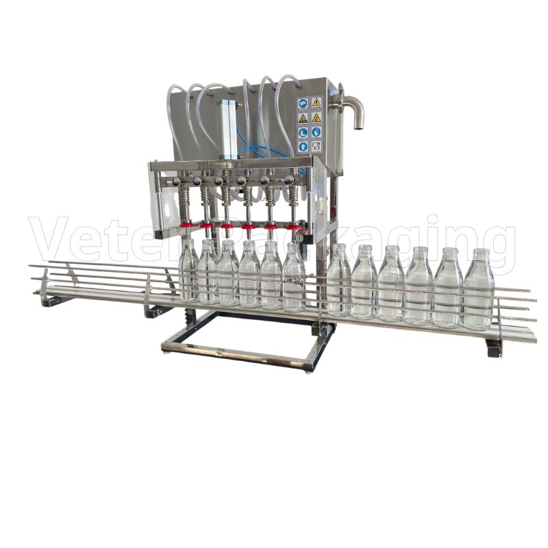 Ημιαυτόματο γεμιστικό μηχάνημα στάθμης, για αφρίζοντα ρευστά προϊόντα σε γυάλινα και πλαστικά μπουκάλια, διαφόρων διαστάσεων.